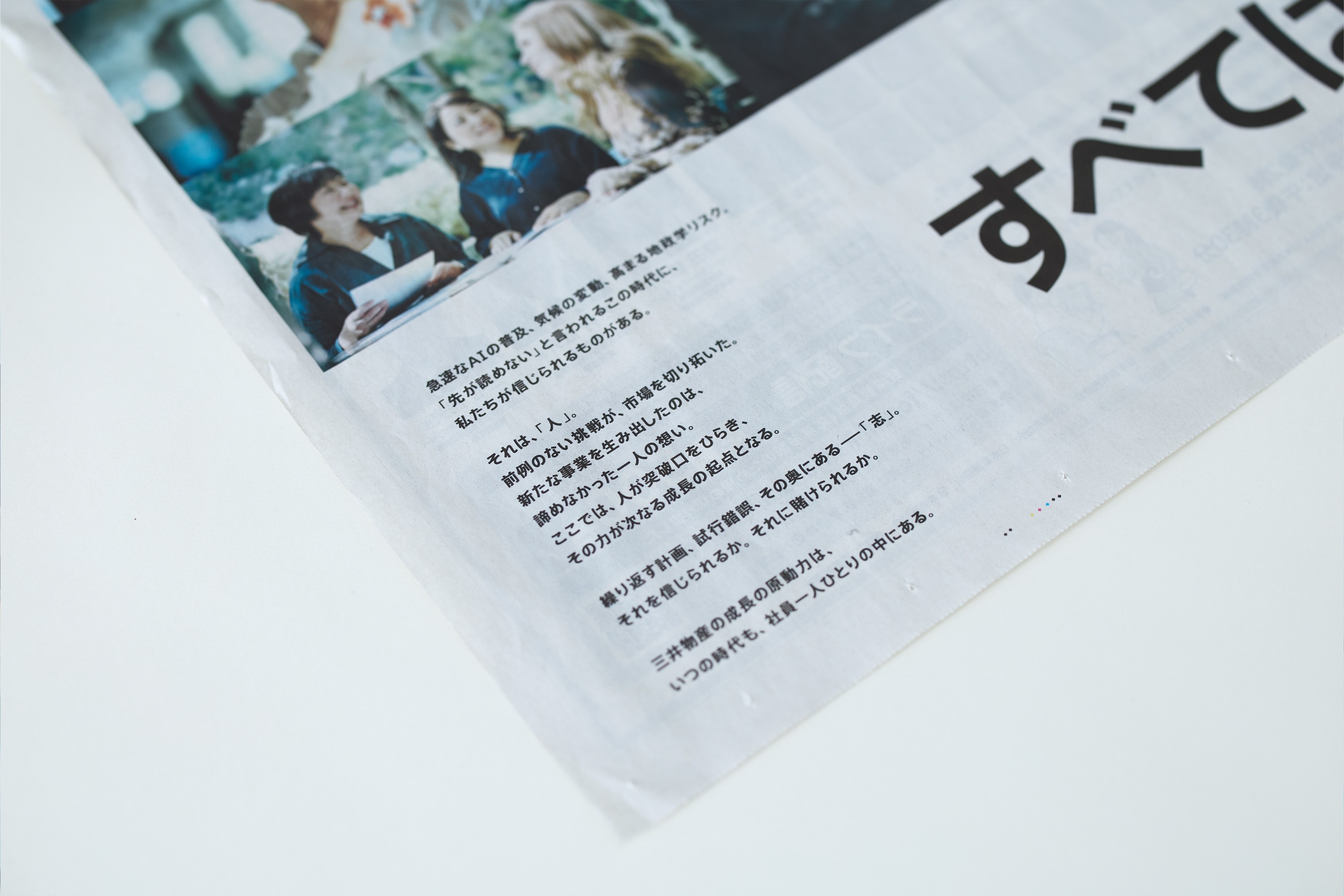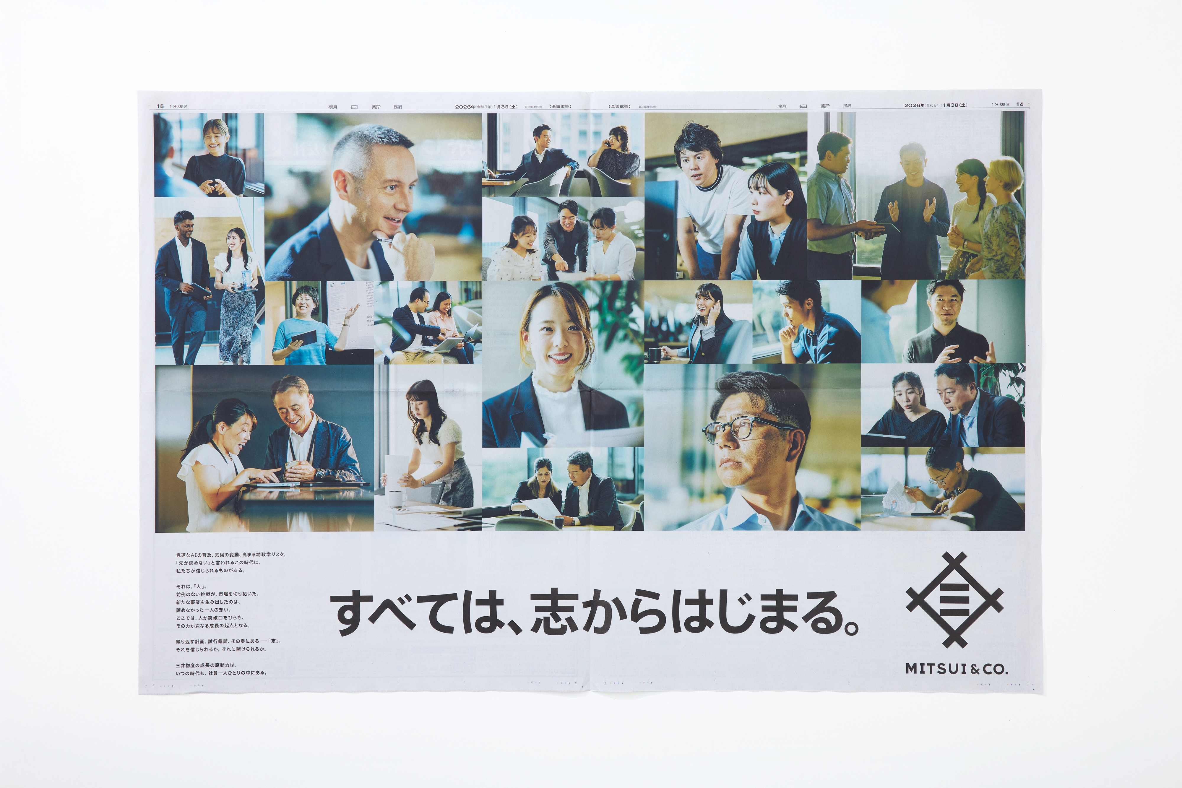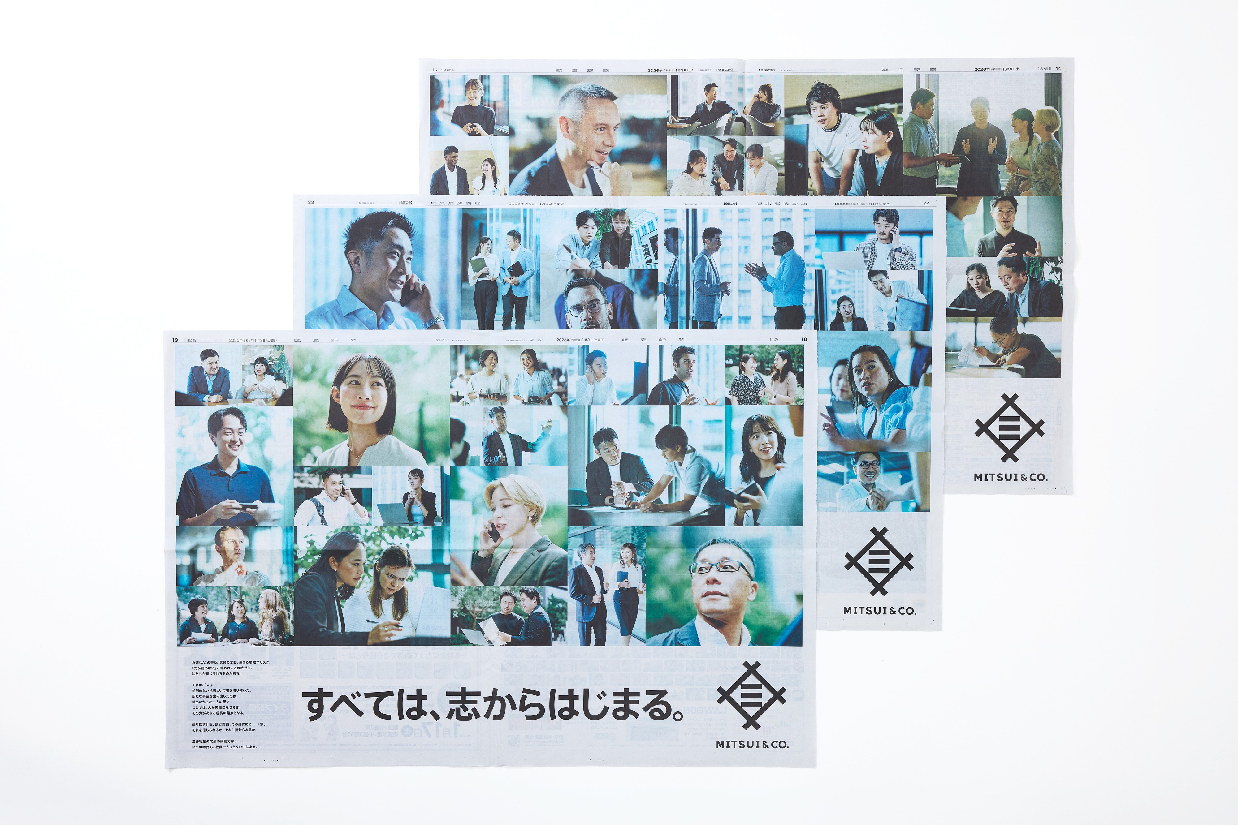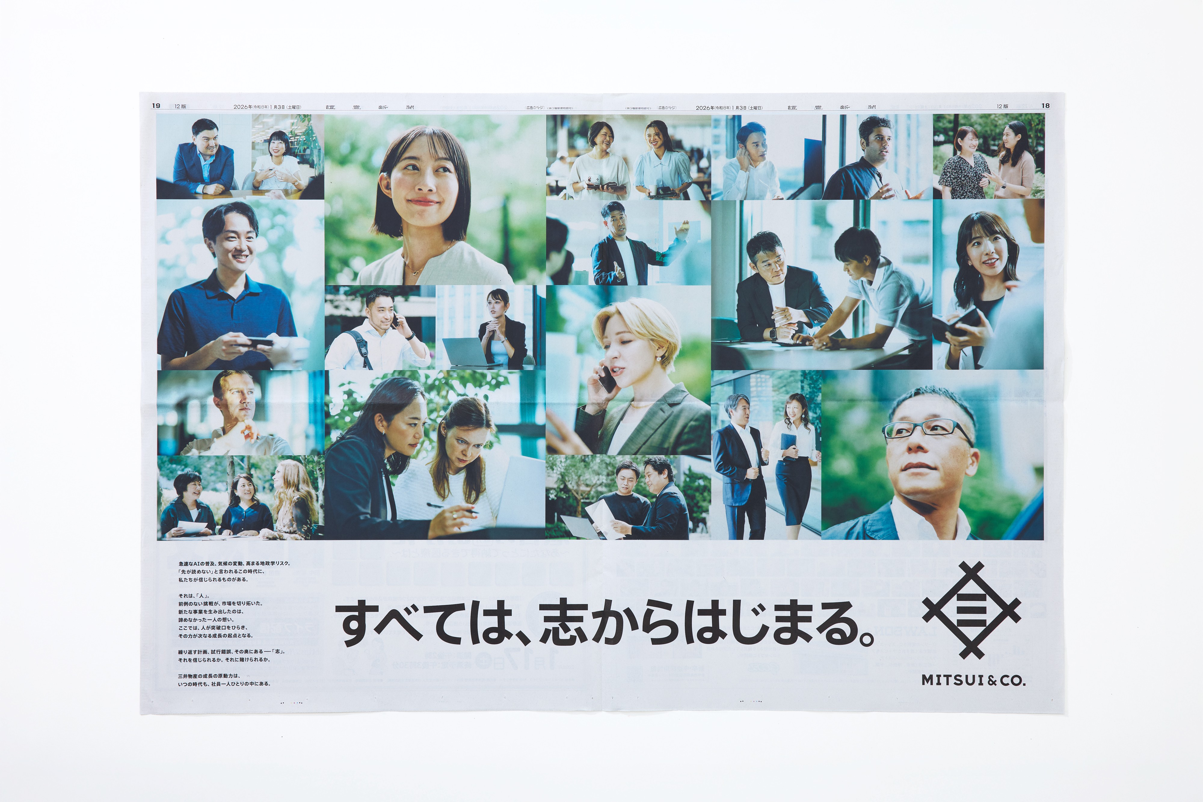 三井物産 新年新聞広告30段「すべては志、からはじまる。」 本キービジュアルは、世のため、人のために世界の難問に挑む三井物産社員の姿とその志を捉えた広告です。1月1日号の日本経済新聞、1月3日号の朝日新聞、読売新聞に掲出されました。